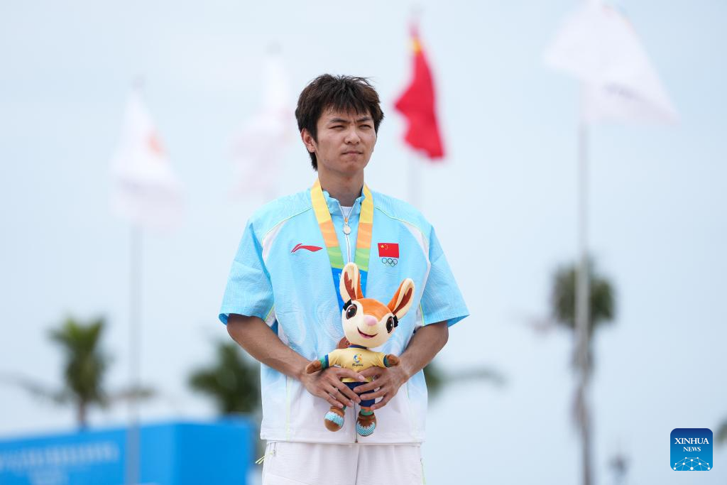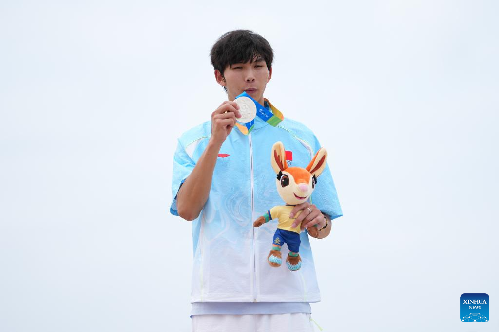 Silver medalist Huang Youchao of China poses for photos during the awarding ceremony of the men's 60m of beach athletics at the 6th Asian Beach Games in Sanya, south China's Hainan Province, April 25, 2026. (Xinhua/Pan Yulong)
