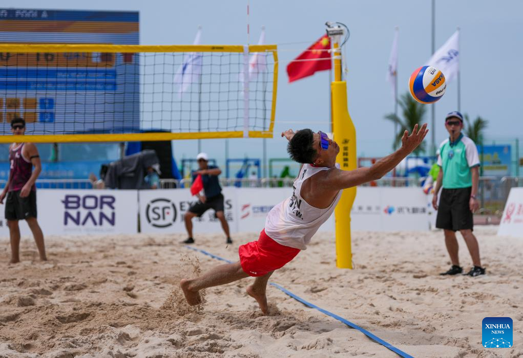 Wang Yanwei of China saves the ball during the beach volleyball men's preliminary pool A match between Wang Yanwei/Wu Jiaxin of China and Musa Alkeer Mou/Mohamed Zakinelabedin of Qatar at the 6th Asian Beach Games in Sanya, south China's Hainan Province, April 25, 2026. (Xinhua/Jigme Dorje)