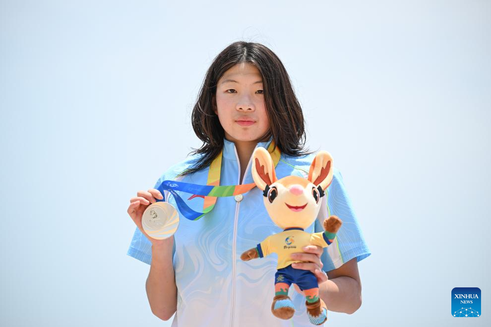 Silver medalist Chen Yijing of China poses for photos during the awarding ceremony for the women's 5km final of open water swimming at the 6th Asian Beach Games in Sanya, south China's Hainan Province, April 25, 2026. (Xinhua/Bei He)