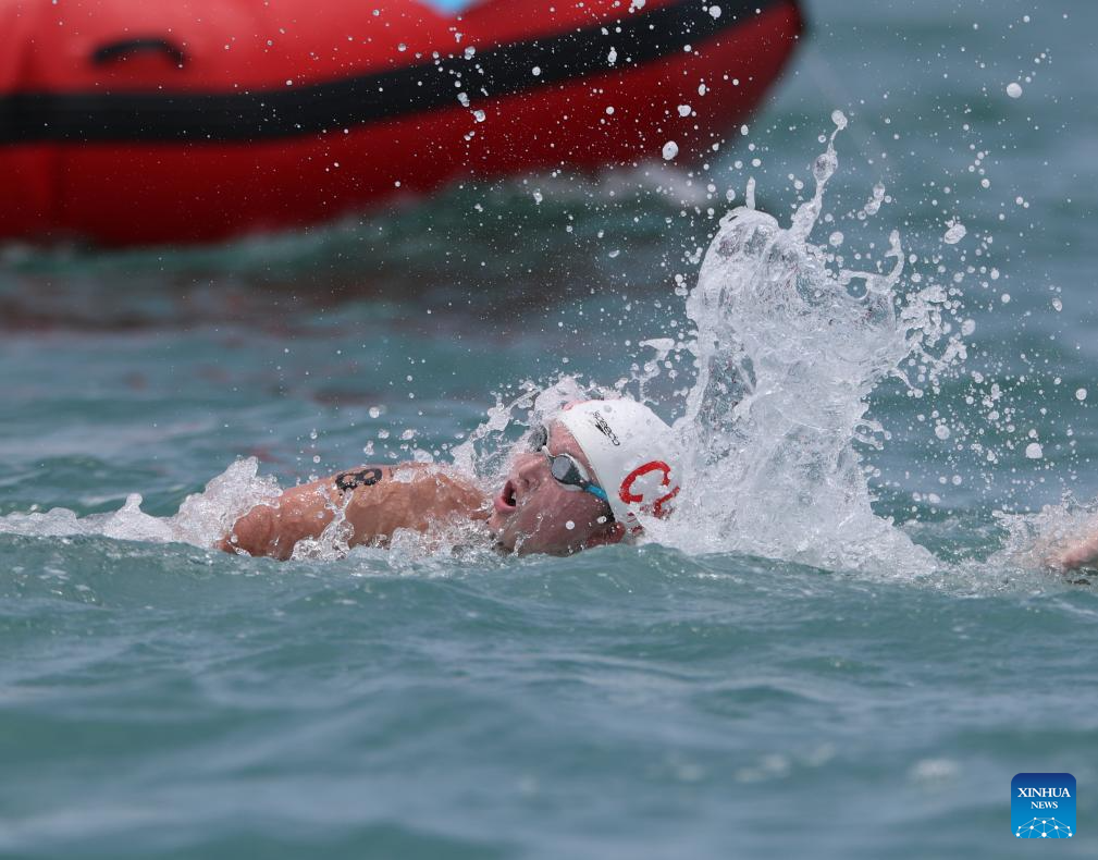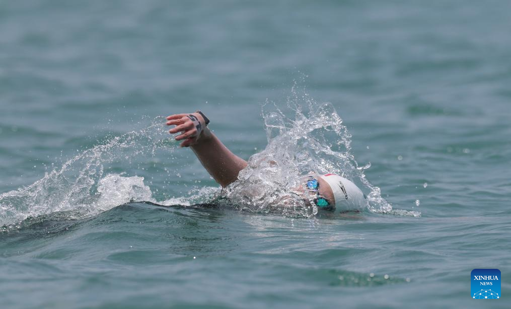 Li Xinxuan of China competes during the women's 5km final of open water swimming at the 6th Asian Beach Games in Sanya, south China's Hainan Province, April 25, 2026. (Photo by Ma Zihan/Xinhua)