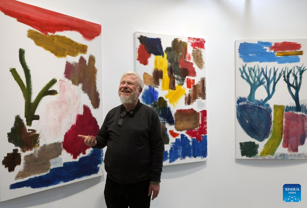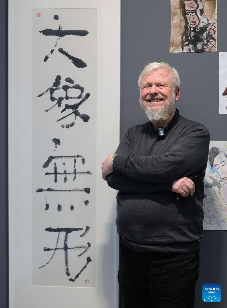 Benoît Vermander poses for a photo with his works at the site of his own exhibition at a museum in Fudan University, east China's Shanghai, April 22, 2026. (Xinhua/Liu Ying)