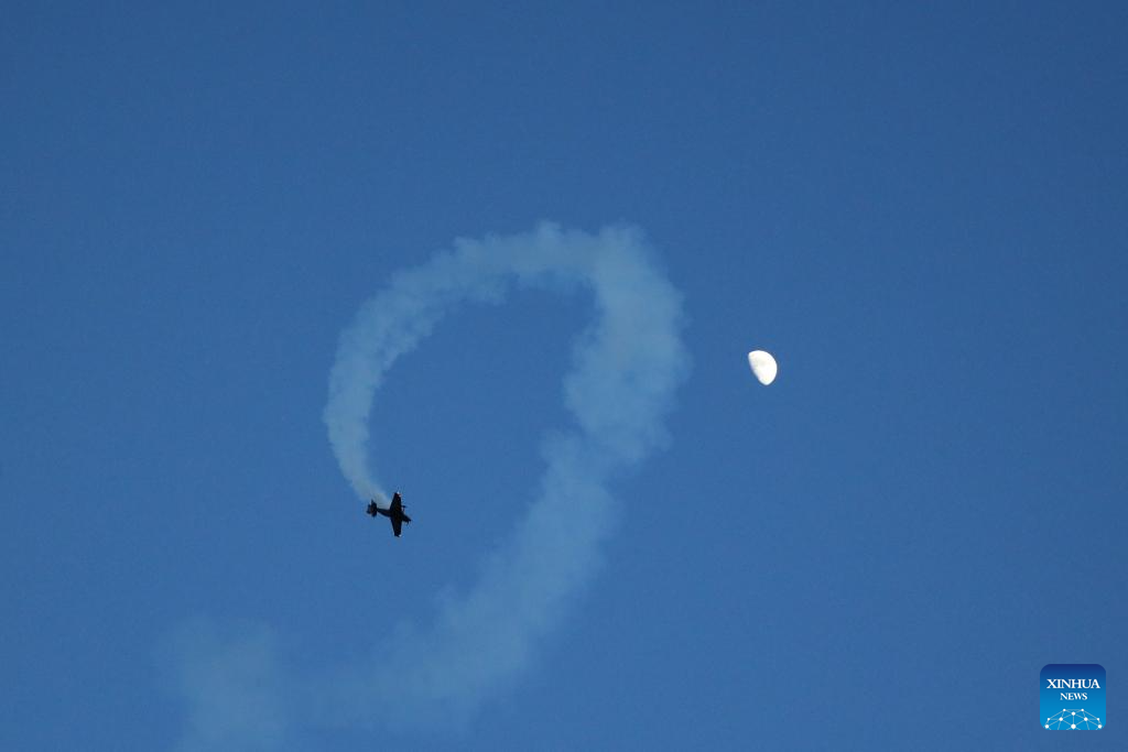 This photo taken on April 25, 2026 shows an aerobatic performance at an international air show in Radom, Poland. (Xinhua/Cui Li)