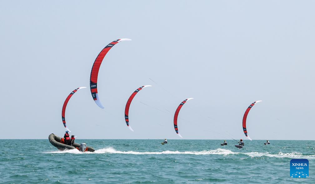 Athletes start during the Formula Kite Women race of sailing at the 6th Asian Beach Games in Sanya, south China's Hainan Province, April 25, 2026. (Xinhua/Zhang Fan)