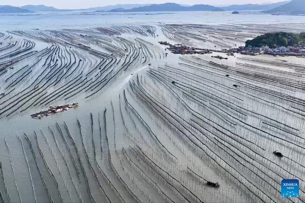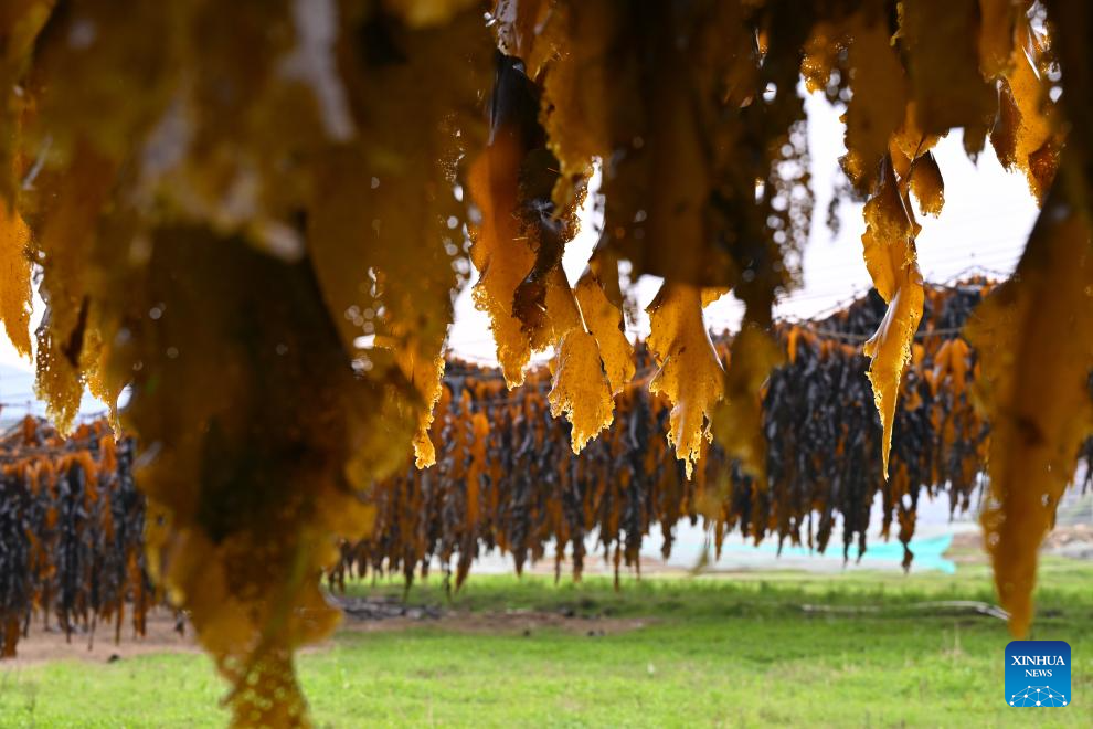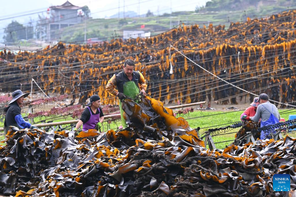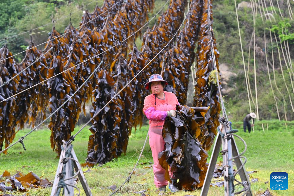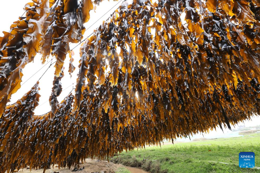Xiapu County, one of China's major kelp production areas, has entered its peak harvesting season. Across Xiahu Town and Shajiang Town of the county, freshly harvested kelp, either suspended on sun-facing hillsides or laid out to dry between rows of bamboo poles over the sea, adorns coastal landscapes, forming a unique scene of harvest.