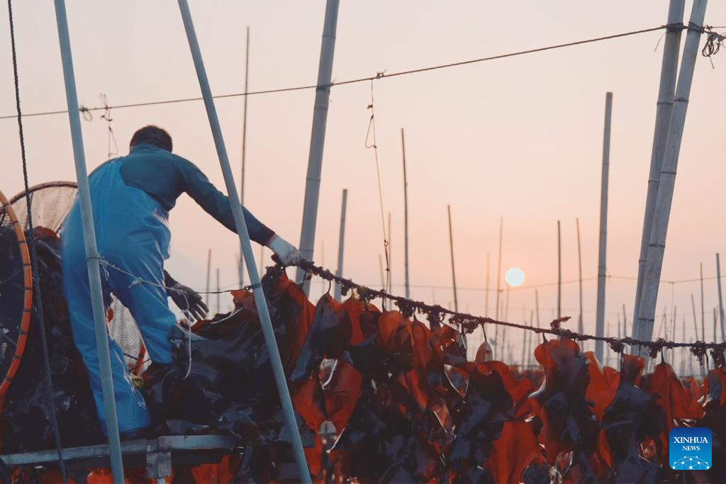 A fisherman dries kelp at dawn in Shajiang Town of Xiapu County, Ningde City, southeast China's Fujian Province, on April 26, 2026.