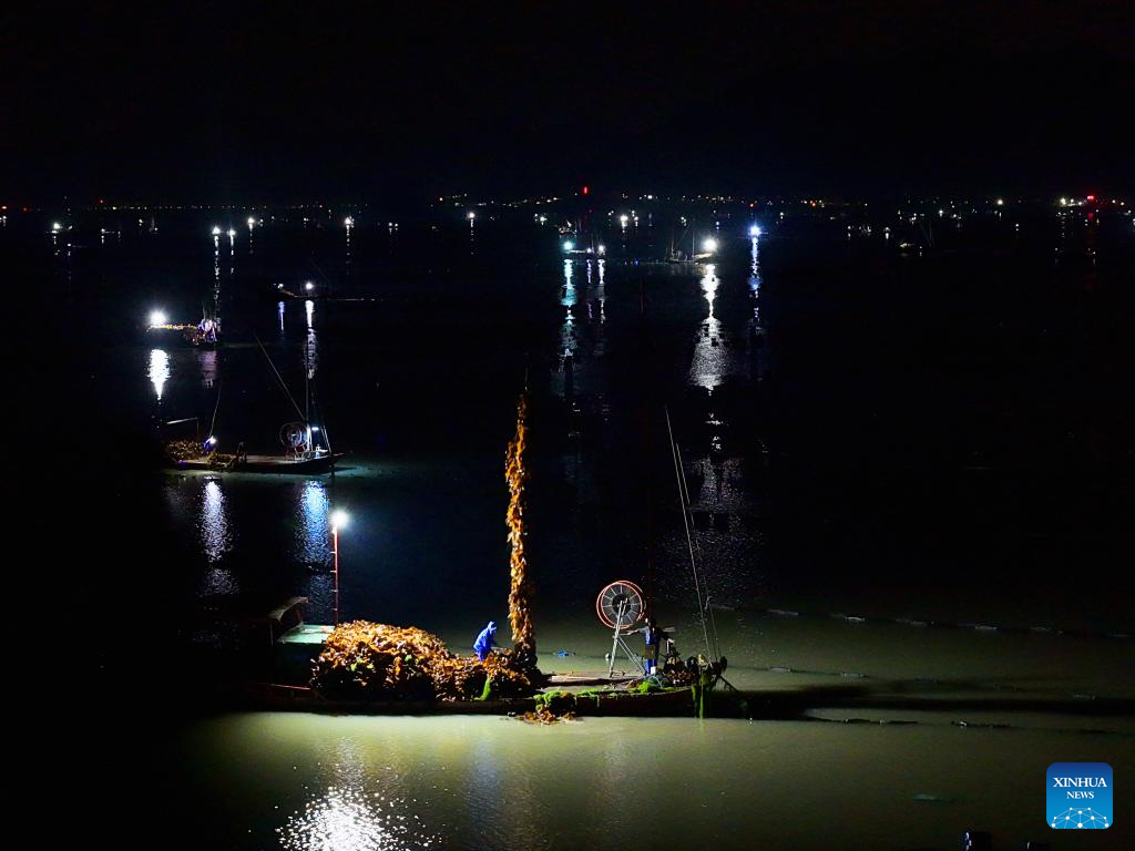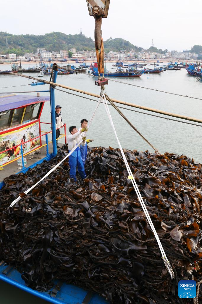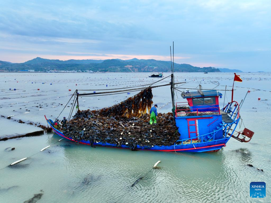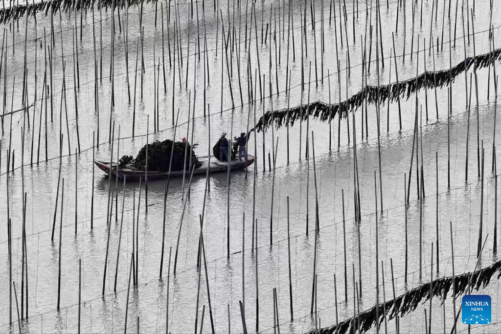 Fishermen harvest kelp in Shajiang Town of Xiapu County, Ningde City, southeast China's Fujian Province, April 26, 2026.