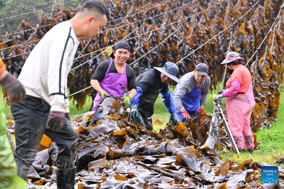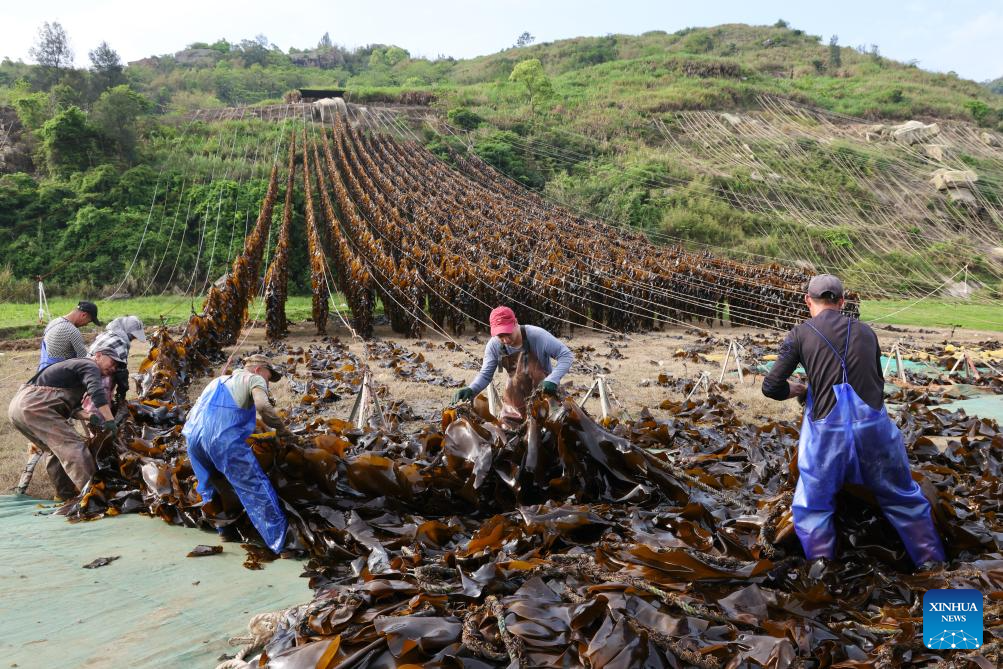 Fishermen hang kelp on ropes to dry in Xiahu Town of Xiapu County, Ningde City, southeast China's Fujian Province, April 25, 2026.