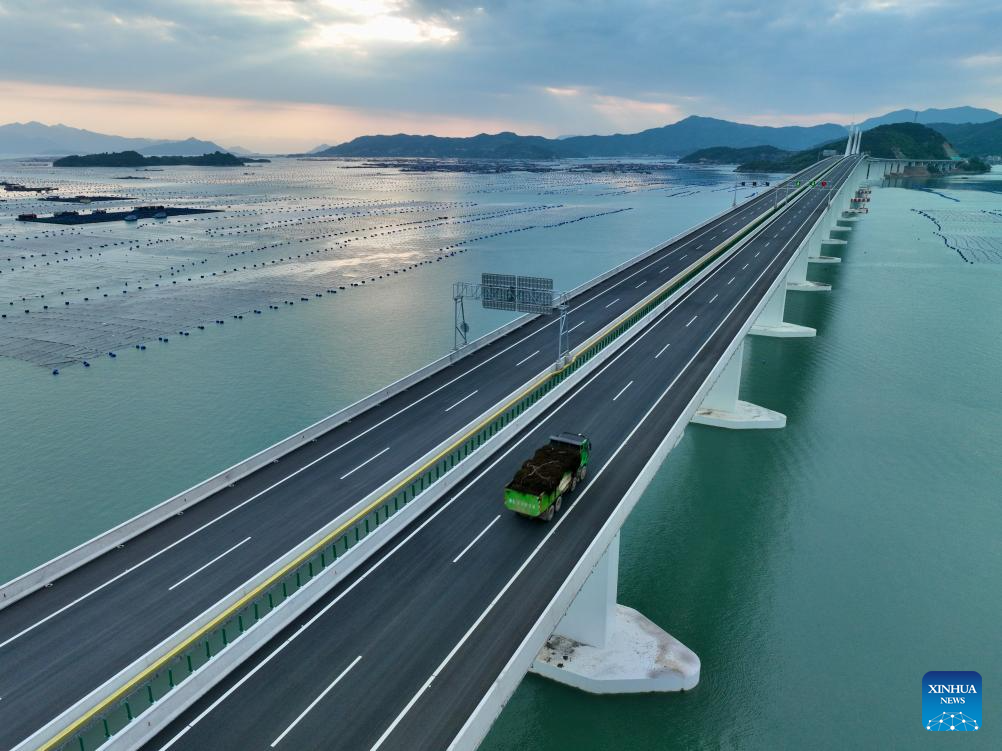 A drone photo taken on April 25, 2026 shows a truck loaded with kelp running on the Dongwuyang grand bridge along the Ningde-Shangrao Expressway in Xiapu County, Ningde City, southeast China's Fujian Province.