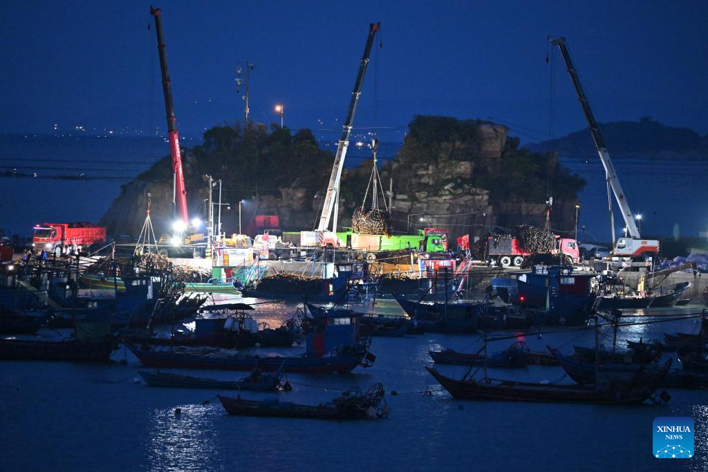 This photo taken on April 25, 2026 shows fishermen transferring kelp at a dock in Xiahu Town of Xiapu County, Ningde City, southeast China's Fujian Province.