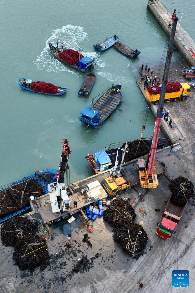 A drone photo taken on April 25, 2026 shows fishermen transferring kelp at a dock in Xiahu Town of Xiapu County, Ningde City, southeast China's Fujian Province.