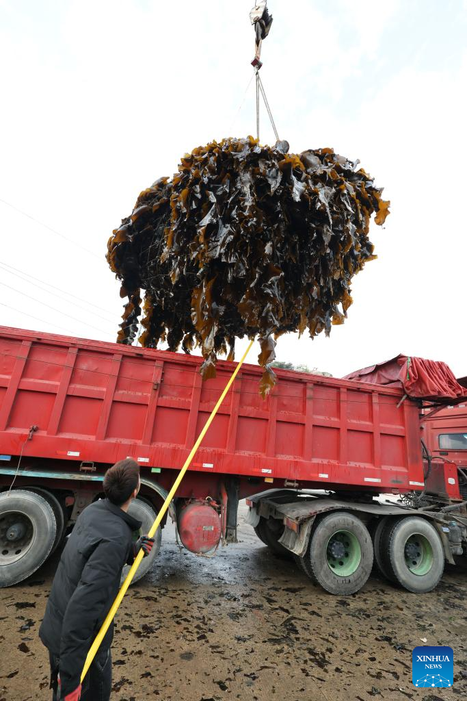 A fisherman loads kelp onto a truck at a dock in Xiahu Town of Xiapu County, Ningde City, southeast China's Fujian Province, April 25, 2026.