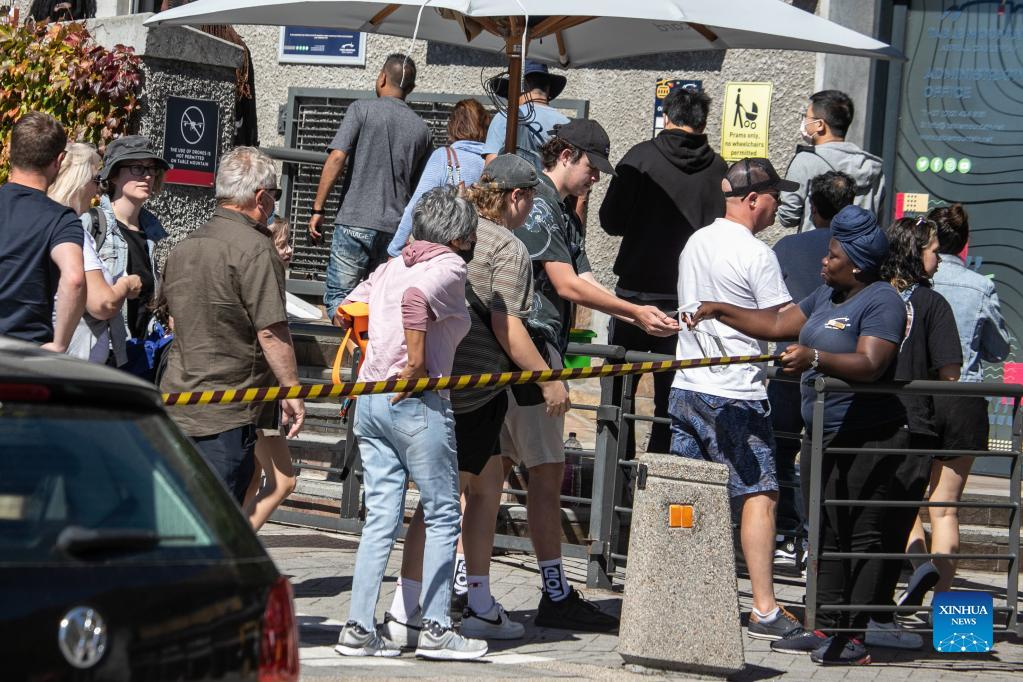Tourists stand in front of a cable car station's ticket office of Table Mountain in Cape Town, Western Cape Province, South Africa, on April 9, 2022. Wesgro, the official tourism, trade and investment promotion agency for Cape Town and Western Cape Province, on Friday said the latest Western Cape tourism figures showed that traveler confidence has returned, with February recording the highest number of arrival and departure international terminal passengers over the last five months. Natural attractions such as Table Mountain and Cape Point were popular with both domestic and international tourists, it said. (Xinhua/Lyu Tianran)