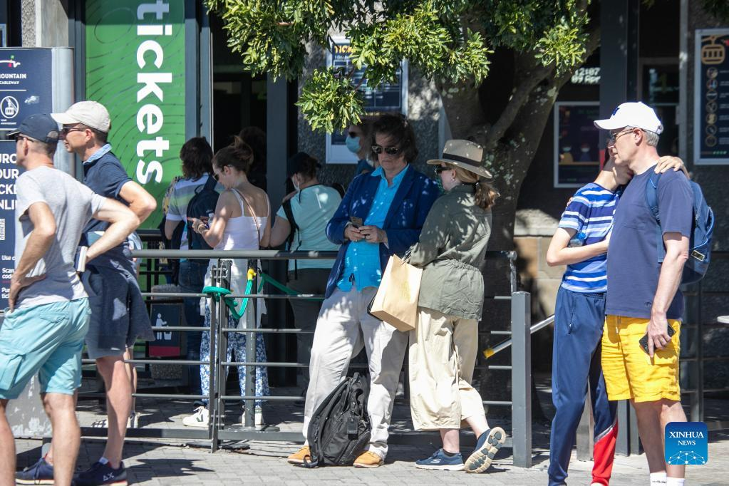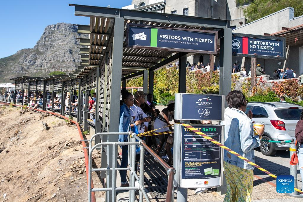 Tourists line up at a cable car station of Table Mountain in Cape Town, Western Cape Province, South Africa, on April 9, 2022. Wesgro, the official tourism, trade and investment promotion agency for Cape Town and Western Cape Province, on Friday said the latest Western Cape tourism figures showed that traveler confidence has returned, with February recording the highest number of arrival and departure international terminal passengers over the last five months. Natural attractions such as Table Mountain and Cape Point were popular with both domestic and international tourists, it said. (Xinhua/Lyu Tianran)