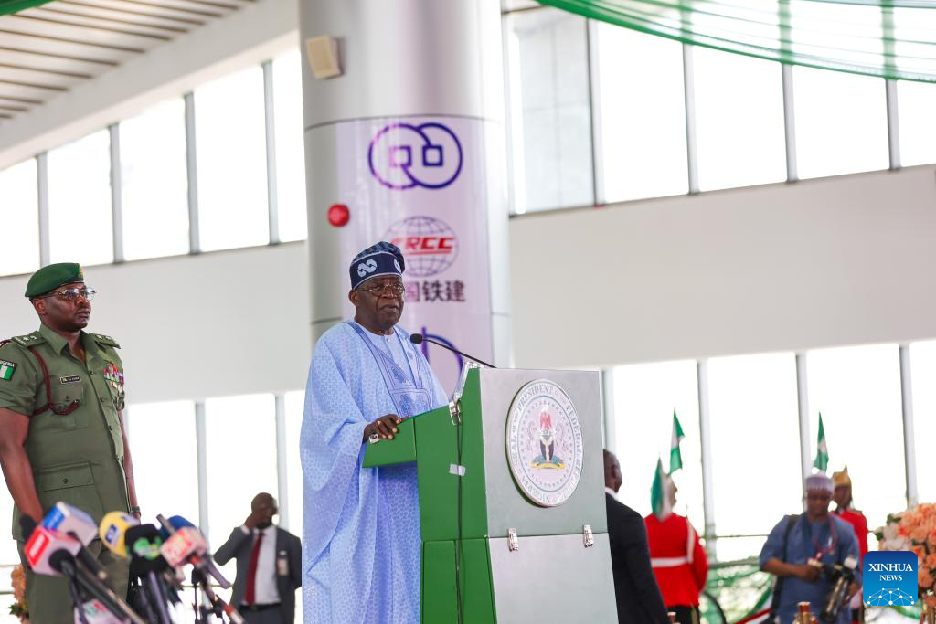Nigerian President Bola Tinubu (C) speaks at the commercial operation ceremony of the Abuja metro rail in Abuja, Nigeria, on May 29, 2024. Since its relaunch for commercial operation about a week ago, talks about the Abuja Rail Mass Transit (ARMT) have been making the rounds, with local media abuzz with the prospect of the light rail system in the fast-developing Nigerian capital city. (Photo by Yan Yujuan/Xinhua)