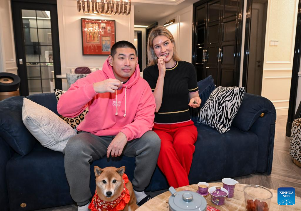 Aleksandra Antonenko and her husband Zhao Yiwei tease their dog at home in Shanghai, east China, Feb. 6, 2026.