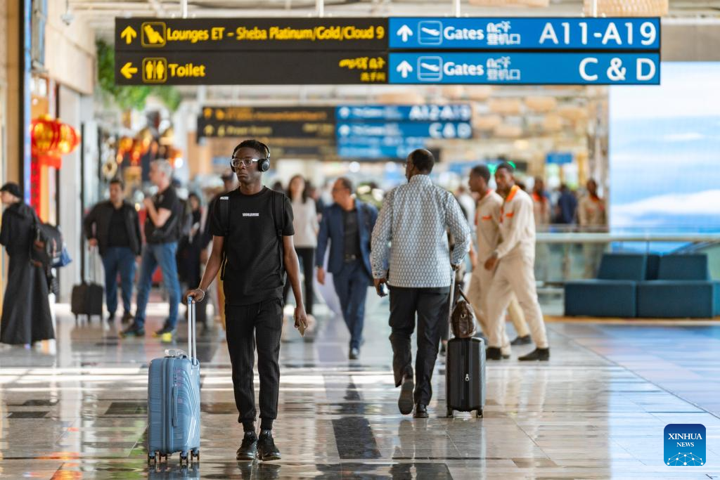 People walk at the Addis Ababa Bole International Airport in Addis Ababa, Ethiopia, Feb. 16, 2026. Addis Ababa, the capital of Ethiopia, whose name means "new flower" in Amharic, is located in the country's central highlands and enjoys a mild and pleasant climate. Home to rich cultural heritage and historical sites, the city also hosts the headquarters of the African Union, making it an important hub for multilateral diplomacy in Africa. (Xinhua/Xie Jianfei)