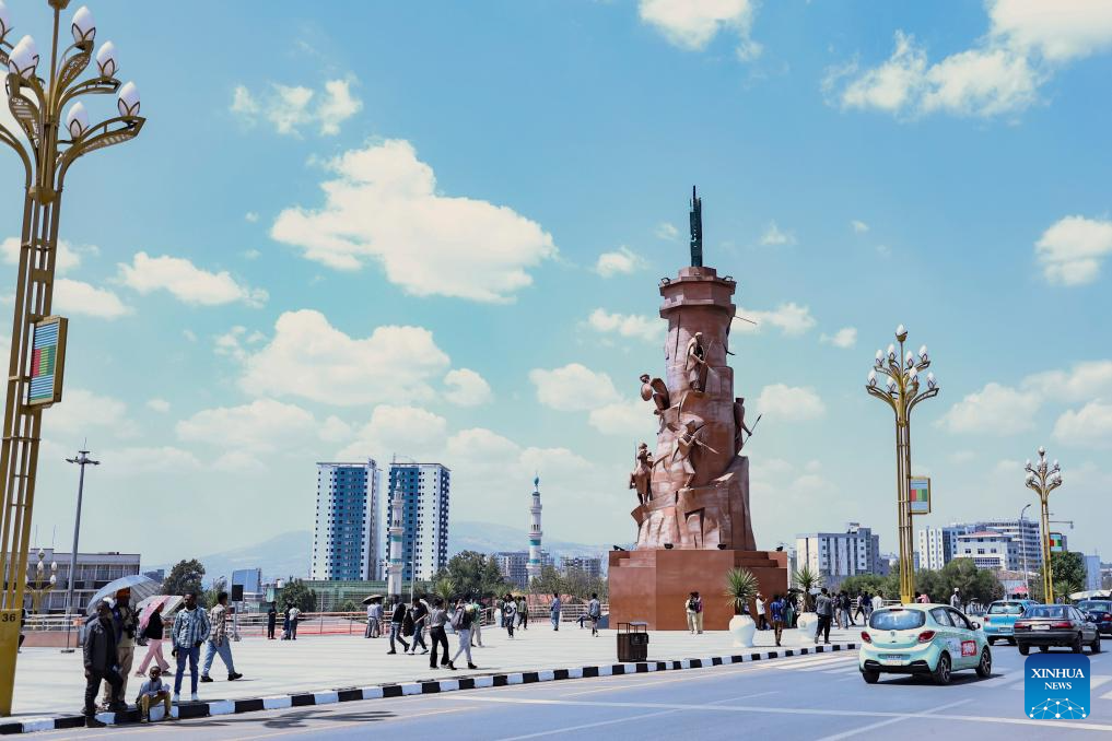 People pass by the Adwa Victory Monument in Addis Ababa, Ethiopia, Feb. 12, 2026. Addis Ababa, the capital of Ethiopia, whose name means "new flower" in Amharic, is located in the country's central highlands and enjoys a mild and pleasant climate. Home to rich cultural heritage and historical sites, the city also hosts the headquarters of the African Union, making it an important hub for multilateral diplomacy in Africa. (Xinhua/Geng Xinning)