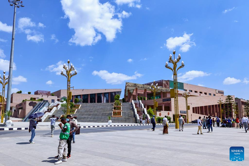 People pass by Addis Ababa City Council in Addis Ababa, Ethiopia, Feb. 12, 2026. Addis Ababa, the capital of Ethiopia, whose name means "new flower" in Amharic, is located in the country's central highlands and enjoys a mild and pleasant climate. Home to rich cultural heritage and historical sites, the city also hosts the headquarters of the African Union, making it an important hub for multilateral diplomacy in Africa. (Xinhua/Geng Xinning)