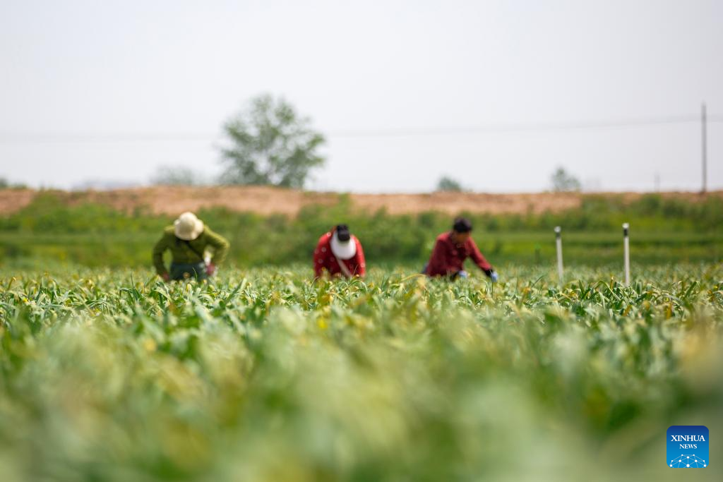 Farmers harvest garlic scapes in a field in Xilingsi Town, Suixian County, Shangqiu City, central China's Henan Province, April 20, 2026.