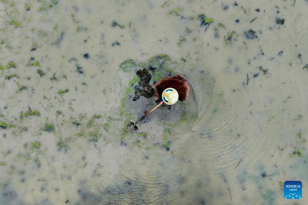 Villagers transplant rice seedlings in a field in Tianya District, Sanya, south China's Hainan Province, April 20, 2026.