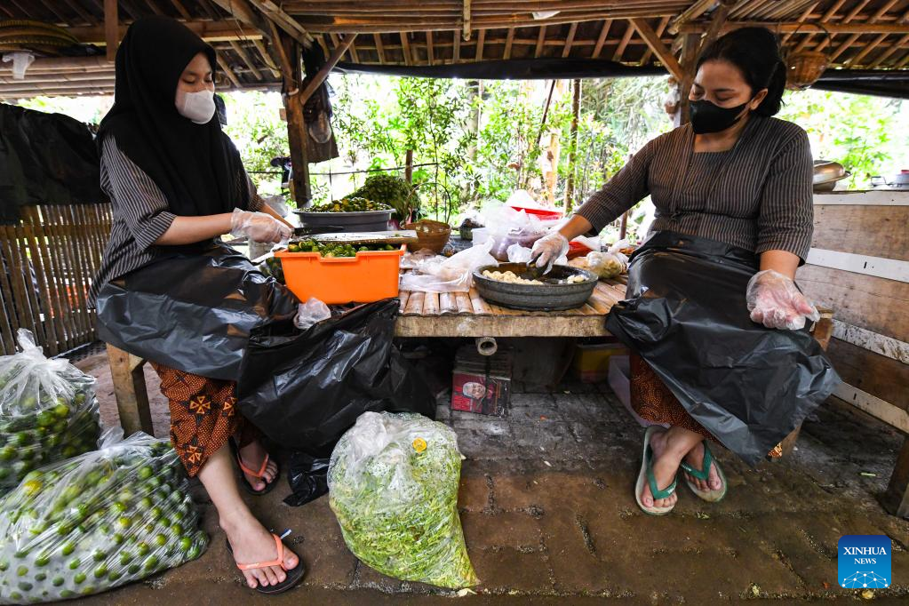 Staff members make seasonings for food at a restaurant named Warung Tuman in South Tangerang, Indonesia, April 1, 2022. Located in the woods, this restaurant is locally famous for its Javanese and West Sumatra cuisines. Local people and people from nearby cities such as Jakarta come here to enjoy food in the embrace of nature. (Xinhua/Xu Qin)