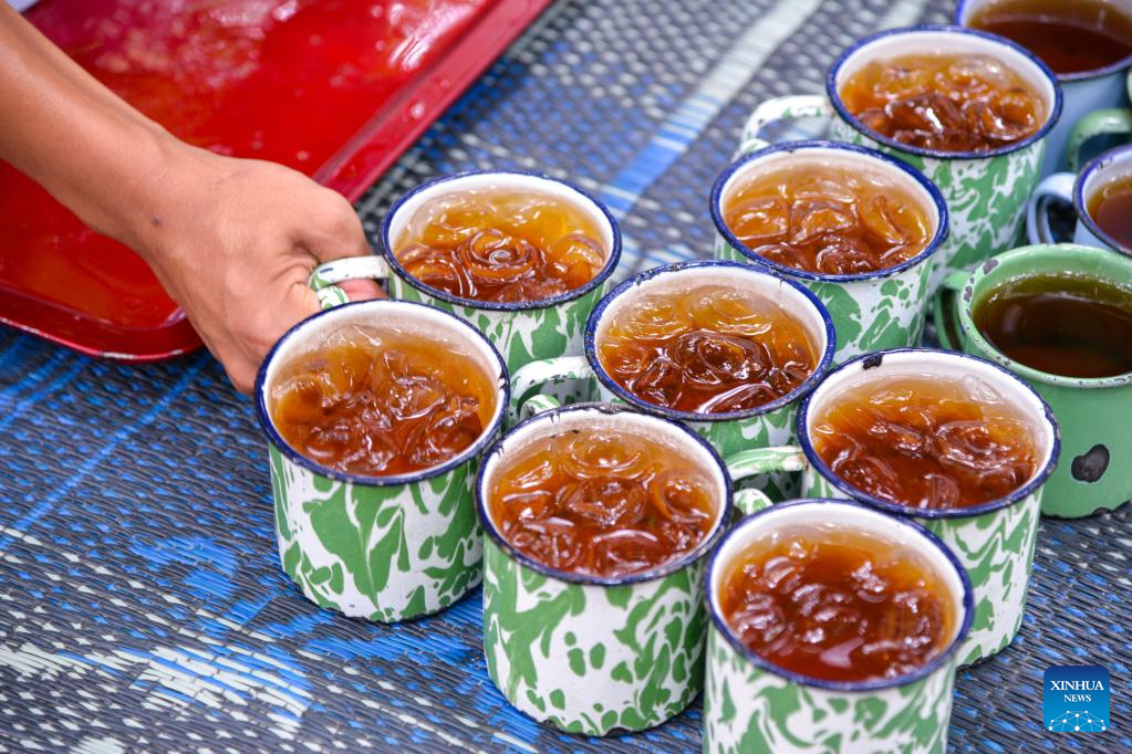 A staff serves drinks to diners at a restaurant named Warung Tuman in South Tangerang, Indonesia, April 1, 2022. Located in the woods, this restaurant is locally famous for its Javanese and West Sumatra cuisines. Local people and people from nearby cities such as Jakarta come here to enjoy food in the embrace of nature. (Xinhua/Xu Qin)