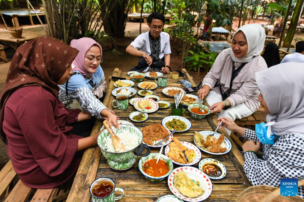 Staff members prepare meals for diners at a restaurant named Warung Tuman in South Tangerang, Indonesia, April 1, 2022. Located in the woods, this restaurant is locally famous for its Javanese and West Sumatra cuisines. Local people and people from nearby cities such as Jakarta come here to enjoy food in the embrace of nature. (Xinhua/Xu Qin)