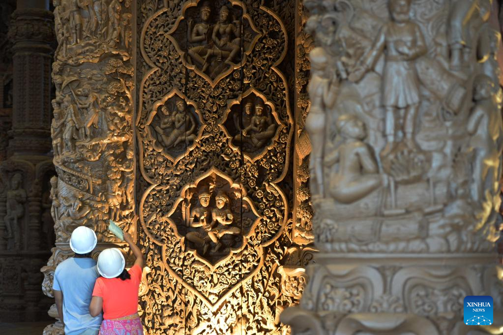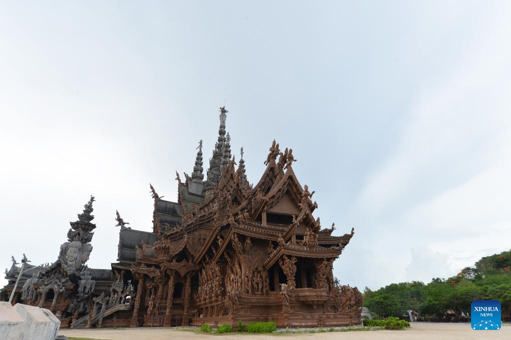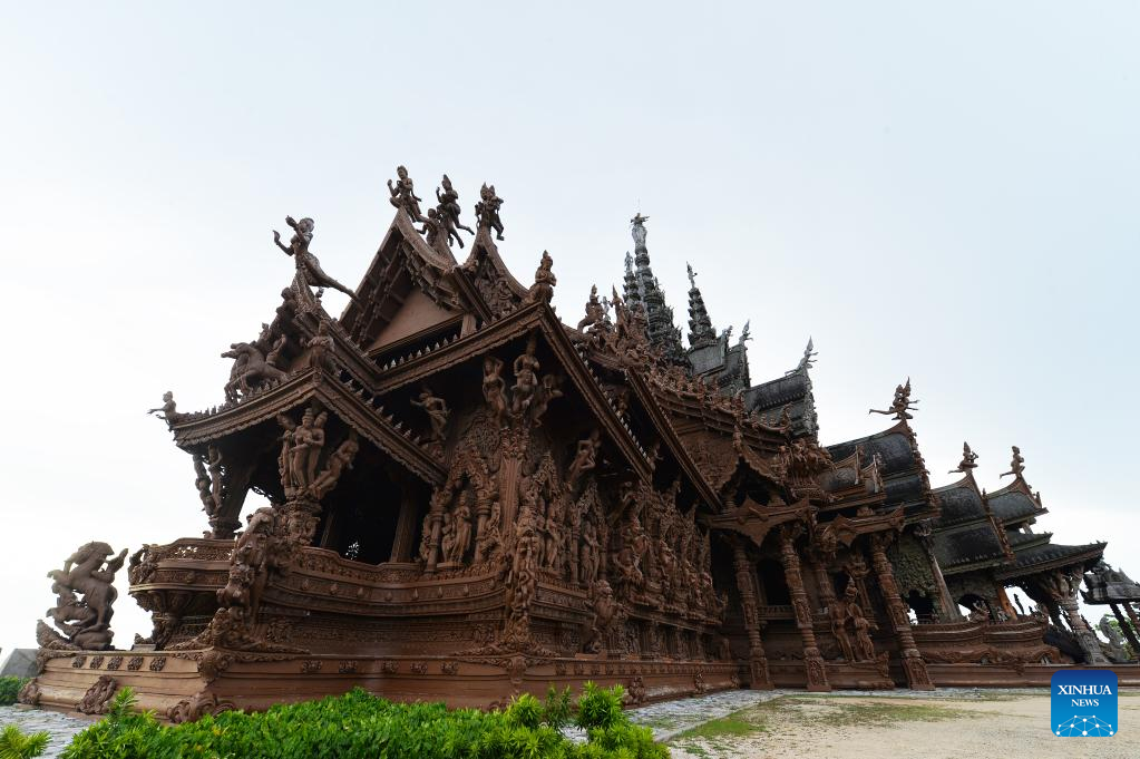 Photo taken on June 13, 2022 shows the Sanctuary of Truth in Pattaya, Thailand. The Sanctuary of Truth is a wood building in Thailand. Inside the sanctuary, there are wood statues and wood carving pieces. (Xinhua/Rachen Sageamsak)