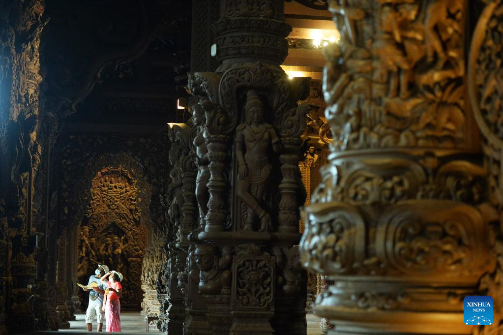 Tourists visit the Sanctuary of Truth in Pattaya, Thailand on June 13, 2022. The Sanctuary of Truth is a wood building in Thailand. Inside the sanctuary, there are wood statues and wood carving pieces. (Xinhua/Rachen Sageamsak)