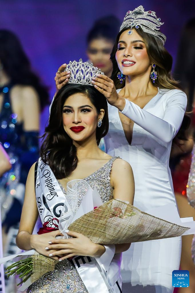 Newly-crowned Binibining Pilipinas (Miss Philippines) Globe Chelsea Fernandez (L) of the Binibining Pilipinas 2022 is seen on stage during the grand coronation night in Quezon City, the Philippines, July 31, 2022. A total of 40 contestants vied for the Binibining Pilipinas 2022 beauty pageant this year. (Xinhua/Rouelle Umali)