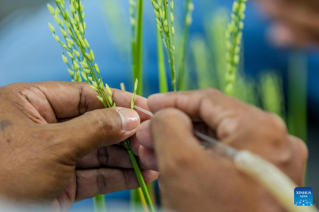 A farmer crossbreeds rice stalks at the International Rice Research Institute (IRRI) in Laguna Province, the Philippines on May 16, 2023. (Xinhua/Rouelle Umali)
