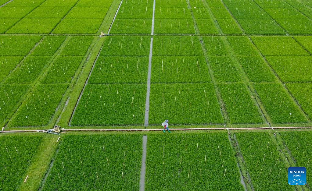 This aerial photo taken on May 16, 2023 shows a farmer walking in a rice field at the International Rice Research Institute (IRRI) in Laguna Province, the Philippines. (Xinhua/Rouelle Umali)