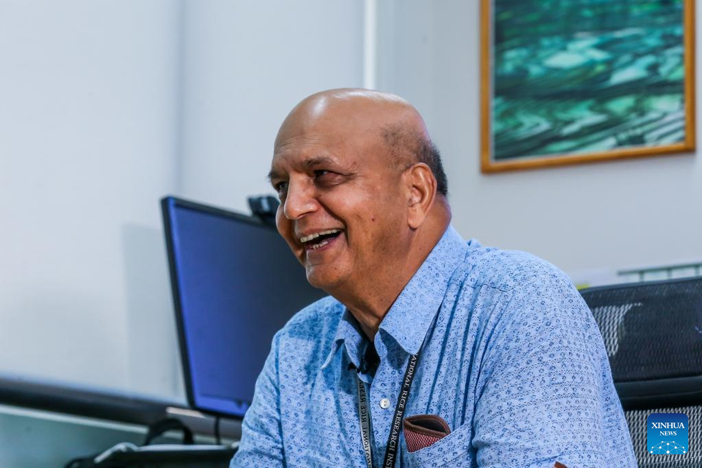 Hans Raj Bhardwaj, research director and head of the rice breeding innovations platform at the International Rice Research Institute (IRRI), speaks during an interview with Xinhua in his office in Laguna Province, the Philippines on May 16, 2023. (Xinhua/Rouelle Umali)