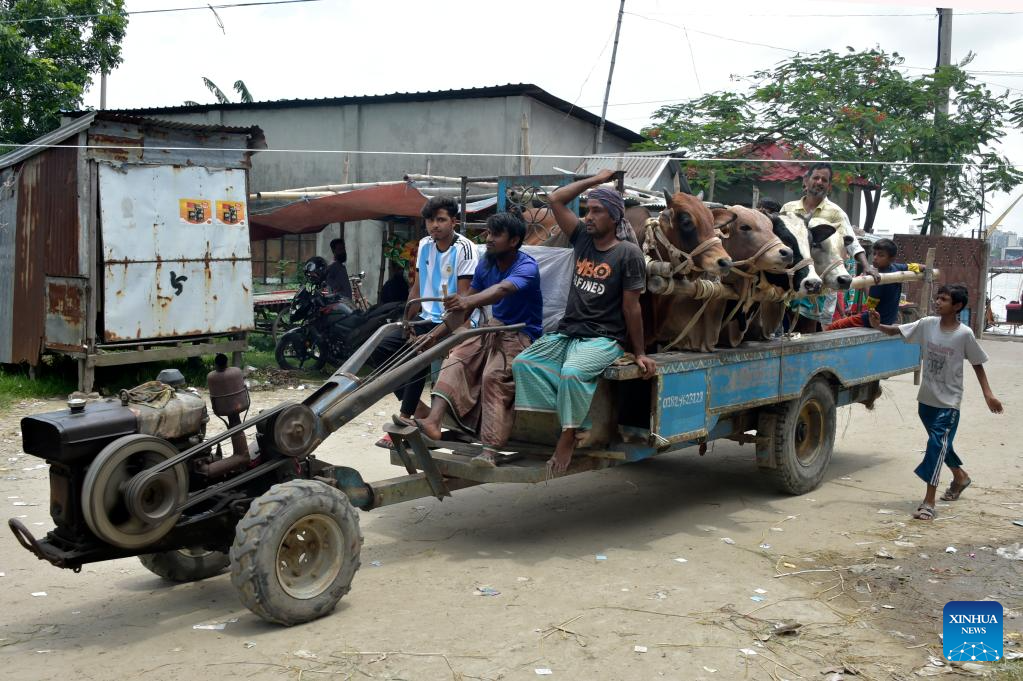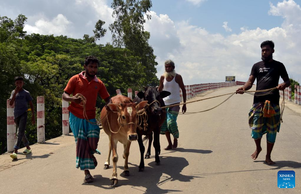 People take cattle to a cattle market in Munshiganj, Bangladesh, on June 25, 2023. (Xinhua)
