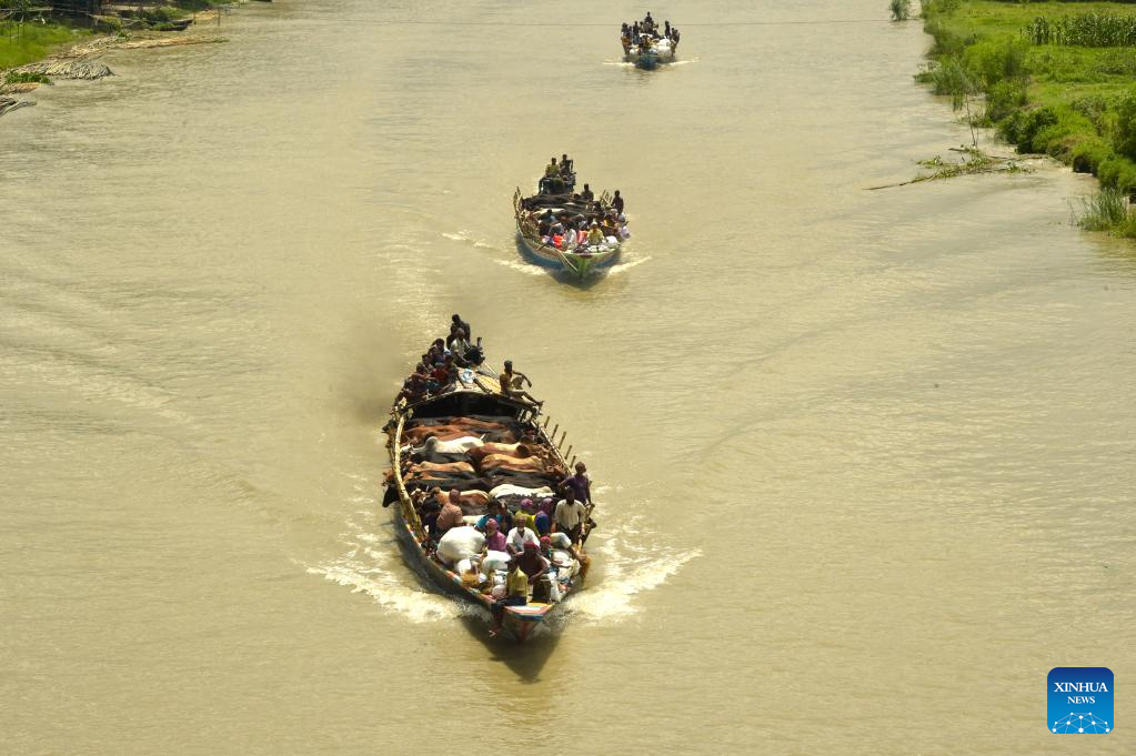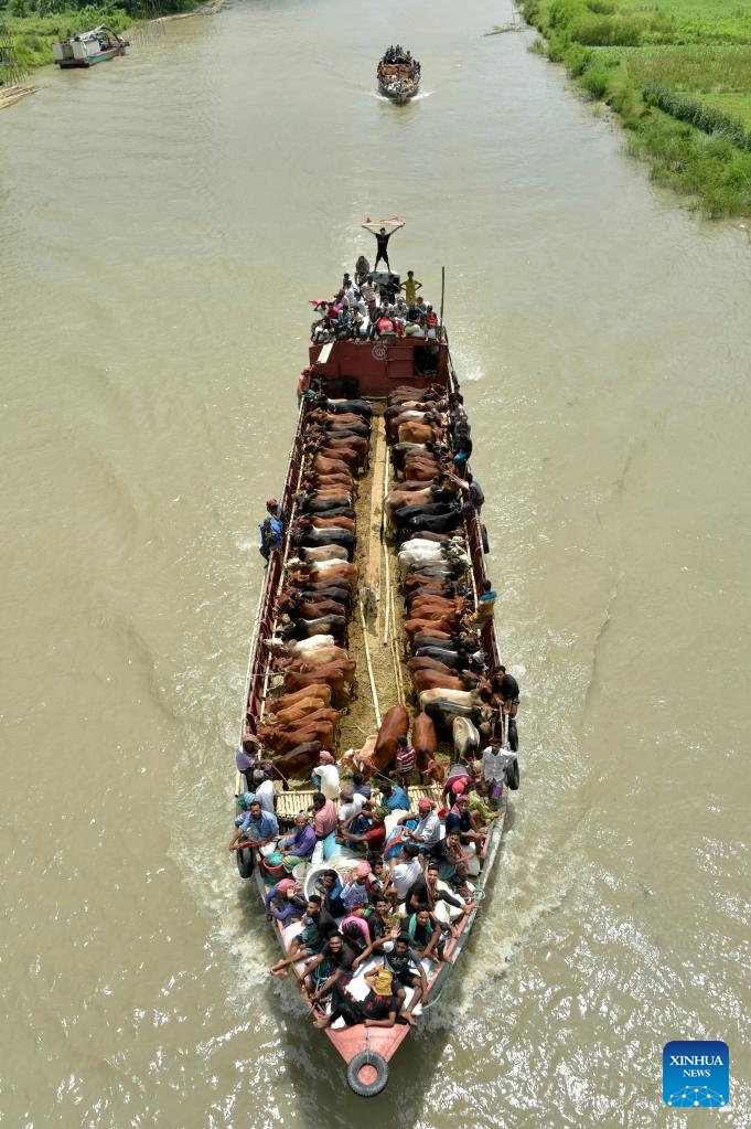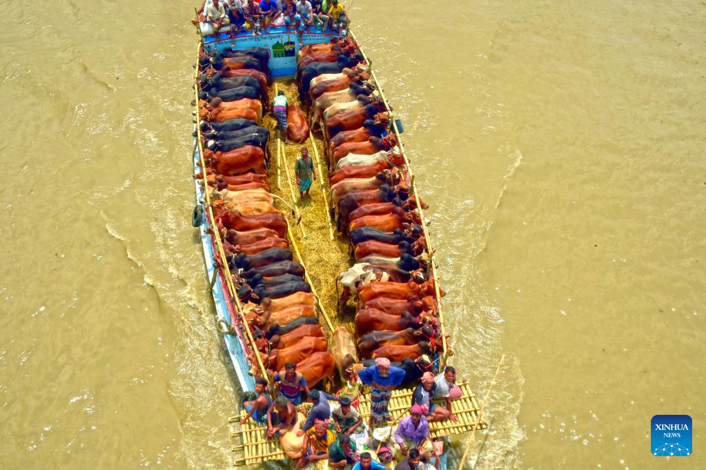 Herds of cattle are transported on vessels in Munshiganj, Bangladesh, on June 25, 2023. (Xinhua)