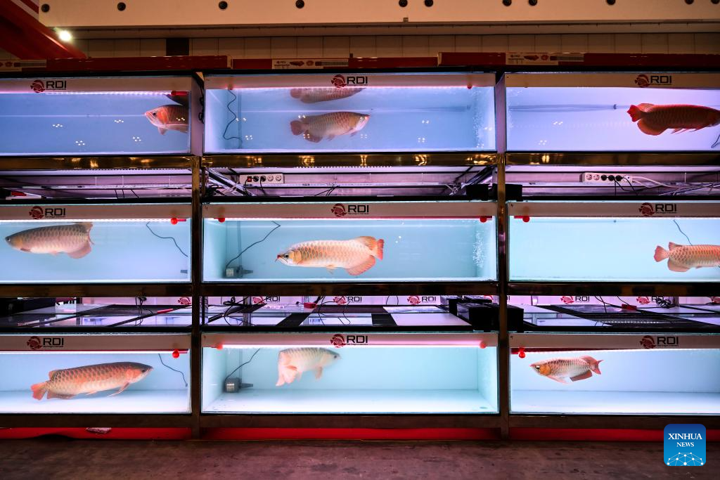 Aquariums filled with arowana fishes are seen during the Nusantara Aquatic 2023 in Tangerang, Banten Province, Indonesia, July 15, 2023. The Nusantara Aquatic (Nusatic) is an exhibition and a contest for ornamental fish in Indonesia. (Xinhua/Veri Sanovri)
