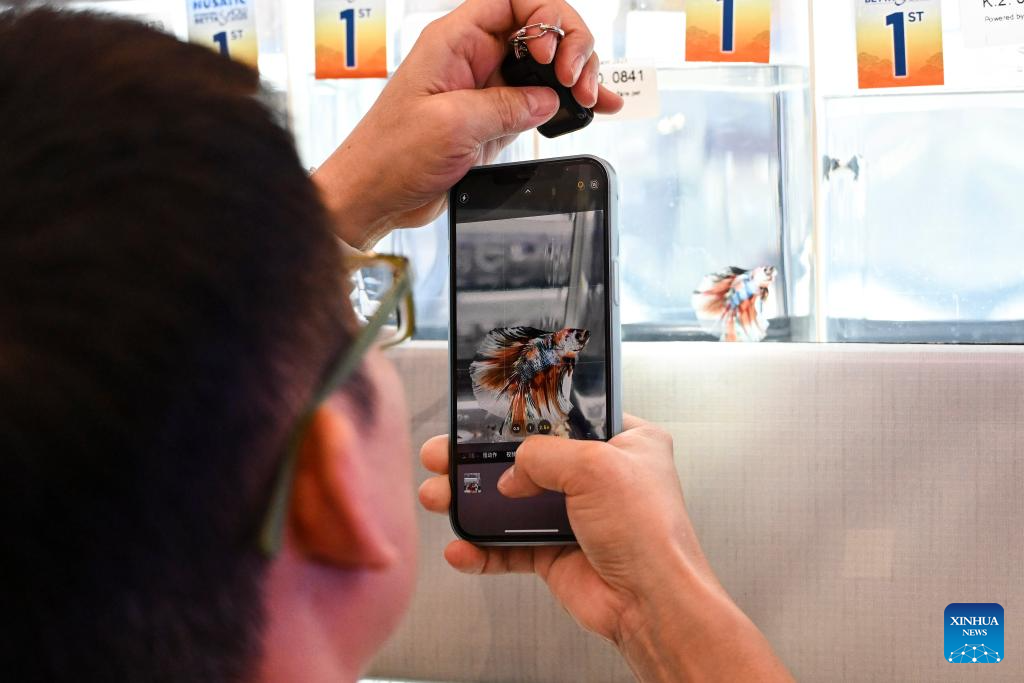 A visitor takes photo of a betta fish during the Nusantara Aquatic 2023 in Tangerang, Banten Province, Indonesia, July 15, 2023. The Nusantara Aquatic (Nusatic) is an exhibition and a contest for ornamental fish in Indonesia. (Xinhua/Veri Sanovri)