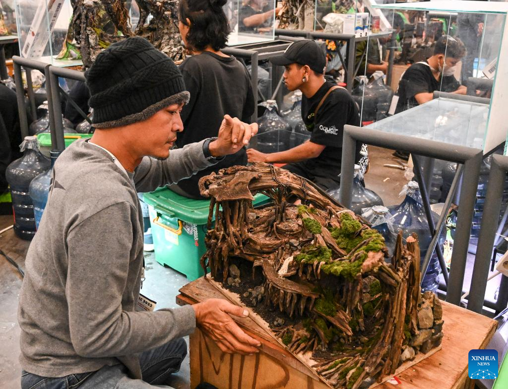 A participant makes an ornament of the aquarium during the Nusantara Aquatic 2023 in Tangerang, Banten Province, Indonesia, July 15, 2023. The Nusantara Aquatic (Nusatic) is an exhibition and a contest for ornamental fish in Indonesia. (Xinhua/Veri Sanovri)