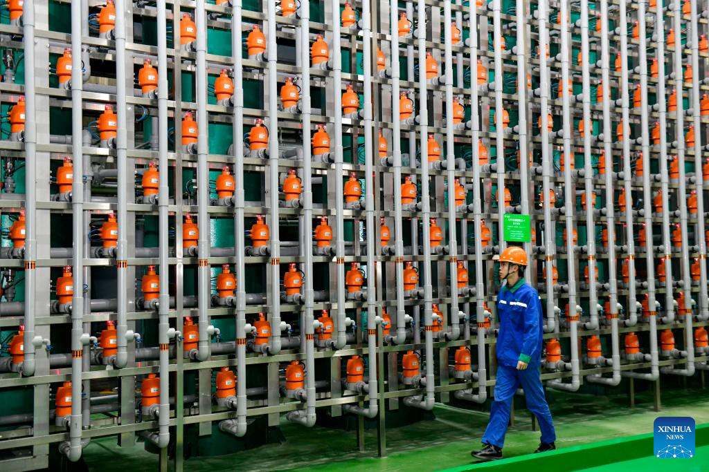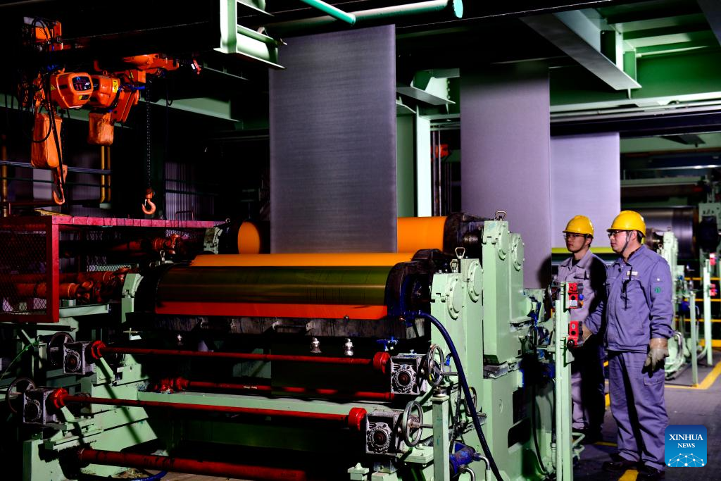 Employees work at a galvanized sheet production line in Boxing County, east China's Shandong Province, Nov. 26, 2023. Boxing County has been strengthening industrial and supply chain construction to boost local economy in recent years. The county has cultivated and formed some leading industries including grain, oil and food processing, metal plates, commercial kitchenware and petrochemical industries. In the first three quarters of this year, the total industrial output value above designated size of Boxing County reached 119.826 billion yuan (about 16.76 billion U.S. dollars). (Xinhua/Guo Xulei)