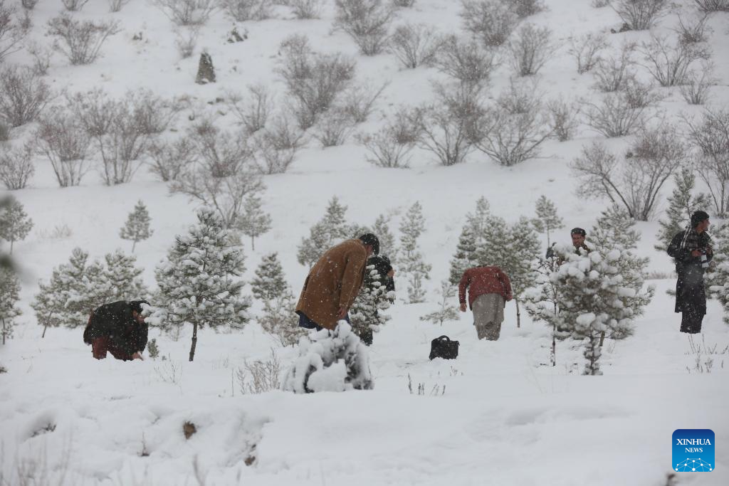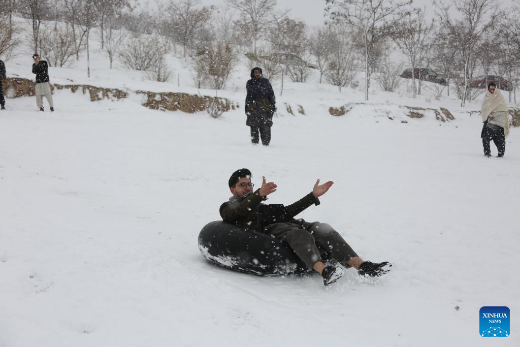 People play in snow in Kabul, capital of Afghanistan, Feb. 3, 2024. (Photo by Saifurahman Safi/Xinhua)