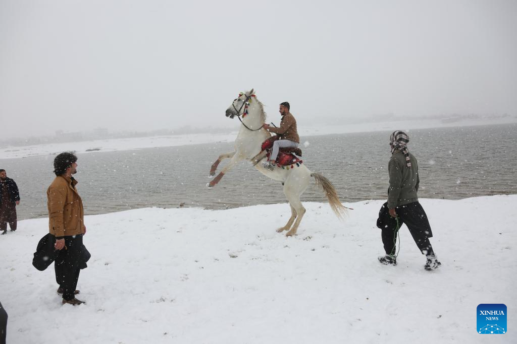 A man rides a horse on snow-covered lakeside in Kabul, capital of Afghanistan, Feb. 3, 2024. (Photo by Saifurahman Safi/Xinhua)