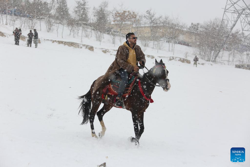 A man rides a horse in snow at Kabul, capital of Afghanistan, Feb. 3, 2024. (Photo by Saifurahman Safi/Xinhua)