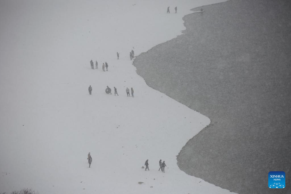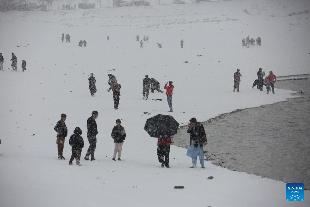 People play on snow-covered lakeside in Kabul, capital of Afghanistan, Feb. 3, 2024. (Photo by Saifurahman Safi/Xinhua)