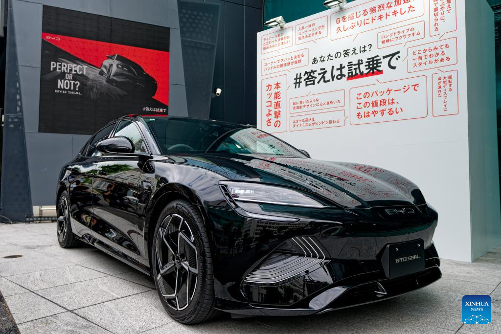 This photo taken on June 25, 2024 shows a BYD SEAL for test driving in Tokyo, Japan. Chinese automaker BYD on Tuesday unveiled its third electric vehicle (EV), the SEAL, in Japan, as the company marches into the country's sedan market.(Xinhua/Zhang Xiaoyu)