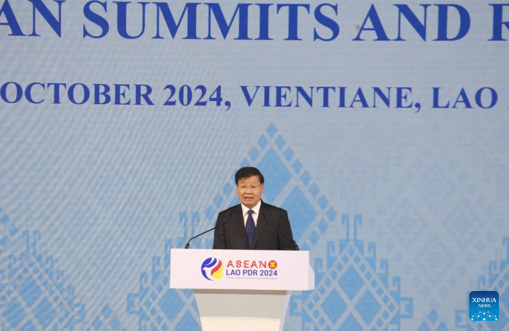 Lao President Thongloun Sisoulith delivers a speech at the opening ceremony of the 44th and 45th Association of Southeast Asian Nations (ASEAN) Summits and related summits in Vientiane, capital of Laos, Oct. 9, 2024. The summits under Laos' ASEAN chairmanship this year are themed "ASEAN: Enhancing Connectivity and Resilience," with focus on building a more integrated, connected and resilient ASEAN community to respond to various pressing challenges and seize opportunities to bring about benefit to ASEAN peoples. (Media Center of ASEAN Summits/Handout via Xinhua)