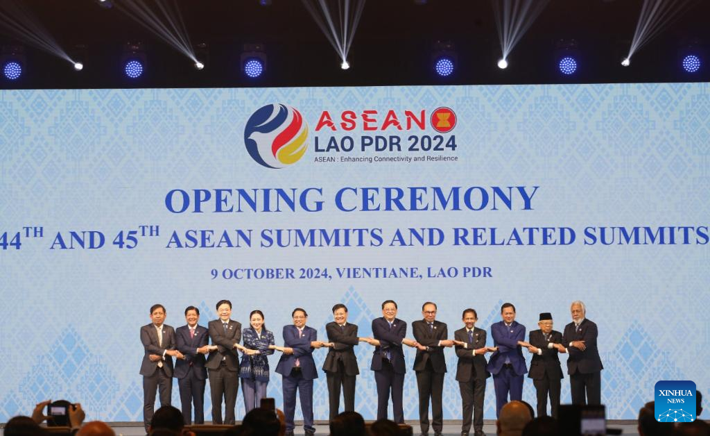 This photo shows the opening ceremony of the 44th and 45th Association of Southeast Asian Nations (ASEAN) Summits and related summits in Vientiane, Laos, Oct. 9, 2024. The summits under Laos' ASEAN chairmanship this year are themed "ASEAN: Enhancing Connectivity and Resilience," with focus on building a more integrated, connected and resilient ASEAN community to respond to various pressing challenges and seize opportunities to bring about benefit to ASEAN peoples. (Media Center of ASEAN Summits/Handout via Xinhua)