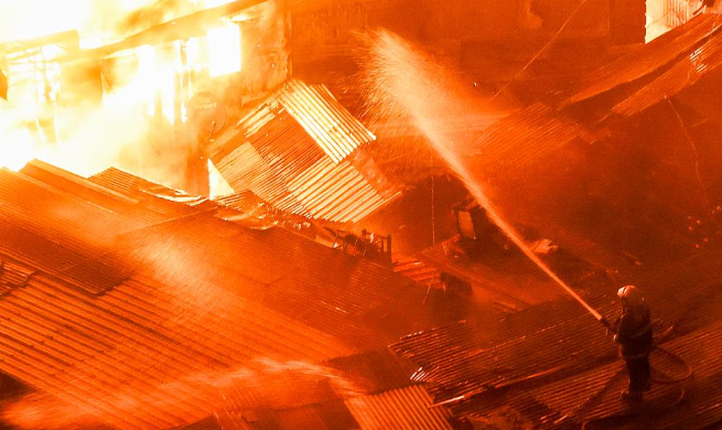Huge fire engulfs shanties at slum area in Quezon City, the Philippines
