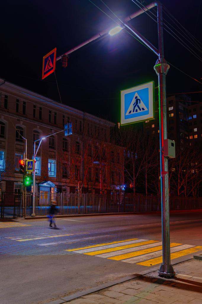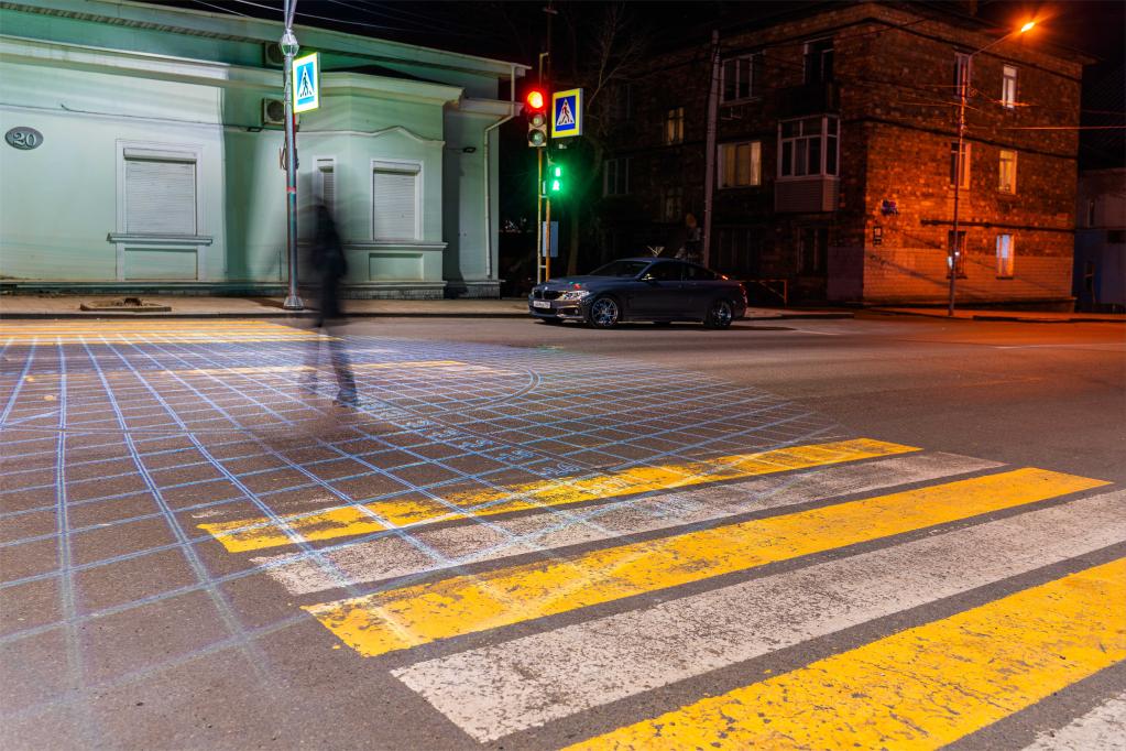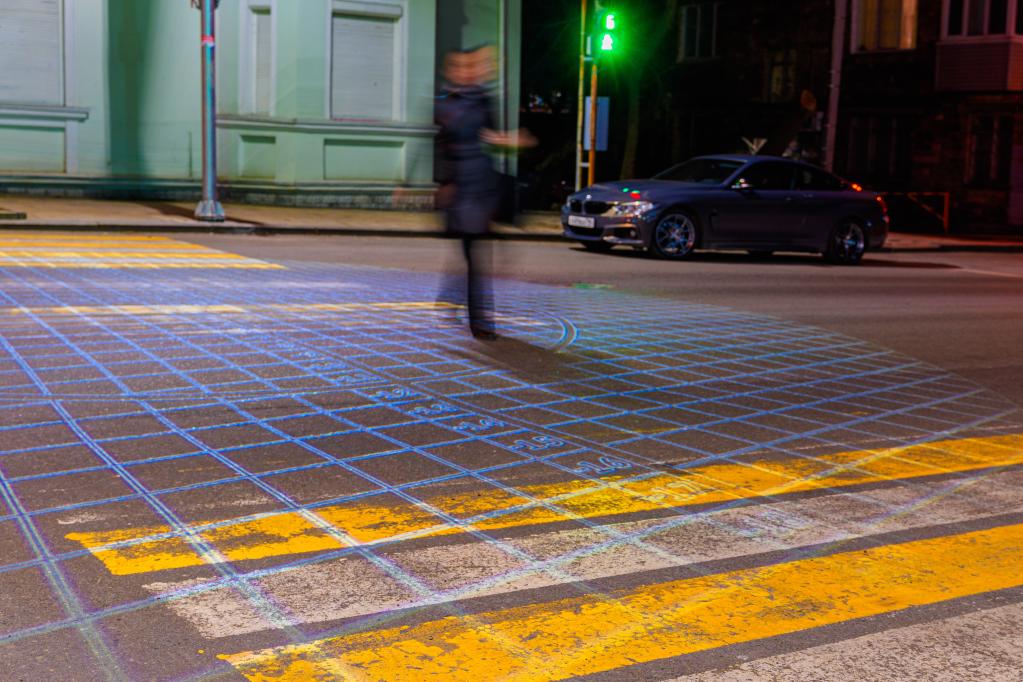 Smart pedestrian crosswalk system has been launched at five crossings in Vladivostok. Laser projection is applied to mark safe areas on the crosswalk to help pedestrians cross the road. (Photo by Guo Feizhou/Xinhua)