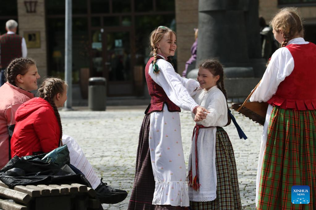 People in traditional costume perform during the 49th International Folklore Festival in Vilnius, Lithuania, on May 29, 2022. The 49th International Folklore Festival, one of the few authentic ethnic music festivals in Europe, wrapped up here in Vilnius on Sunday. (Xinhua/Xue Dongmei)