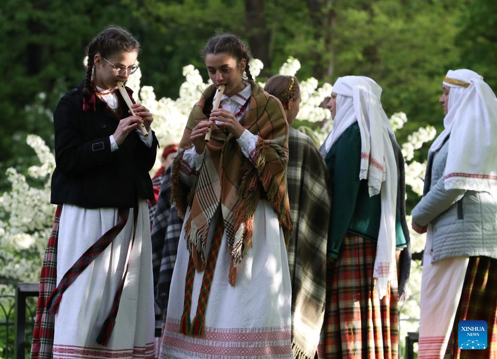 People in traditional costume perform during the 49th International Folklore Festival in Vilnius, Lithuania, on May 27, 2022. The 49th International Folklore Festival, one of the few authentic ethnic music festivals in Europe, wrapped up here in Vilnius on Sunday. (Xinhua/Xue Dongmei)